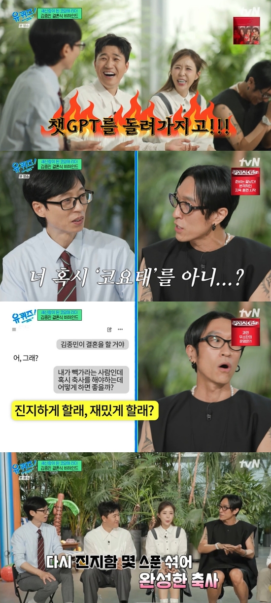 이날 유재석은 "종민 씨는 어땠냐, 축사를 듣고"라며 물었고, 김종민은 "괜히 울면 좀 그렇지 않냐. 많이 참는 게 느껴져서 고맙더라. 빽가 씨 축가가 와닿지 않더라. 왜인지 했더니 챗GTP를 돌려서"라며 털어놨다.