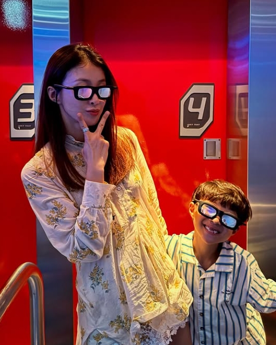 공개된 사진과 영상 속 이시영은 아들과 커플로 안경을 쓴 채 놀이시설을 제대로 즐기는 모습이다.