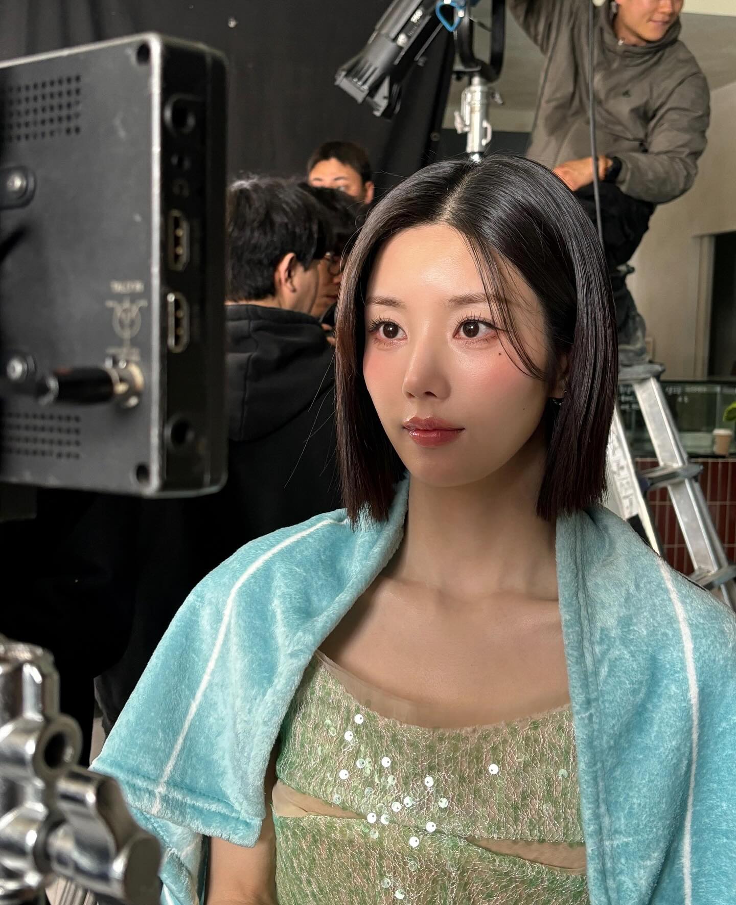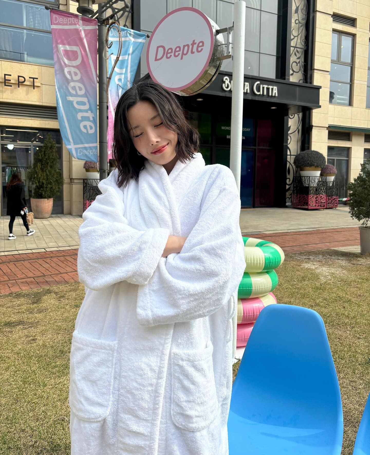 공개된 사진 속 권은비는 광고 촬영을 기다리는 중 커다란 샤워가운으로 온 몸을 감싼 모습이다.