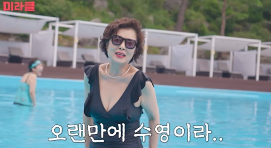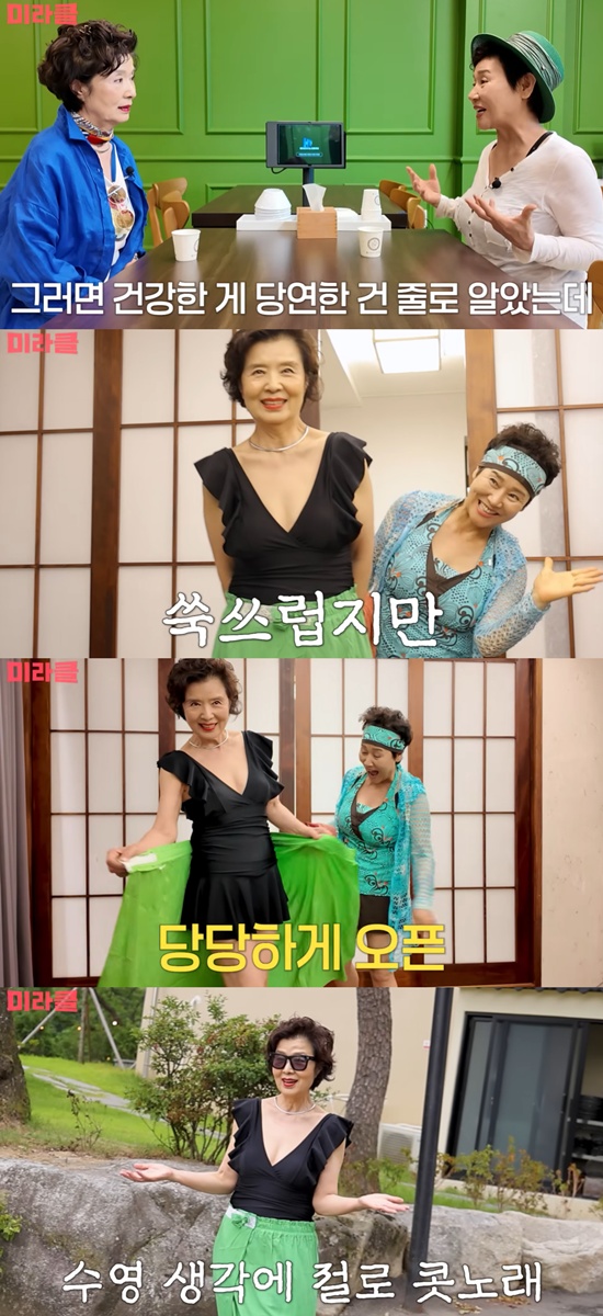 이어 수영복을 입고 나온 윤미라는 73세라는 나이가 믿기지 않는 수영복 자태를 뽐냈다. 장정희는 "나이에 너무 안 어울리죠?"라고 말했고, 윤미라는 "뭐가 안 어울리냐. 내 나이가 몇인데. 그냥 39살로 살자"고 말해 웃음을 더했다.