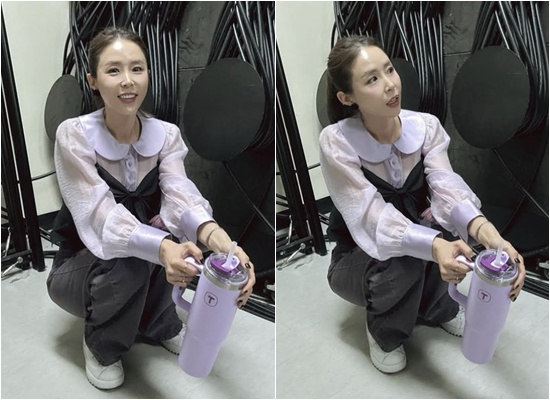 공개된 사진 속 보랏빛 텀블러를 양손에 들고 쪼그려 앉아 있는 모습이다. 텀블러보다 작은 얼굴 크기와 가녀린 몸매가 눈길을 끄는 가운데, 밝은 미소까지 더해져 사랑스러운 분위기를 완성했다.