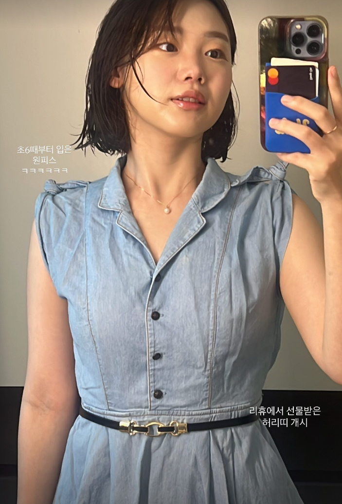 18일 김수민은 개인 계정을 통해 "초6 때부터 입은 원피스 ㅋㅋㅋㅋㅋ선물 받은 허리띠 개시"라는 문구와 함께 사진 한 장을 게재했다.