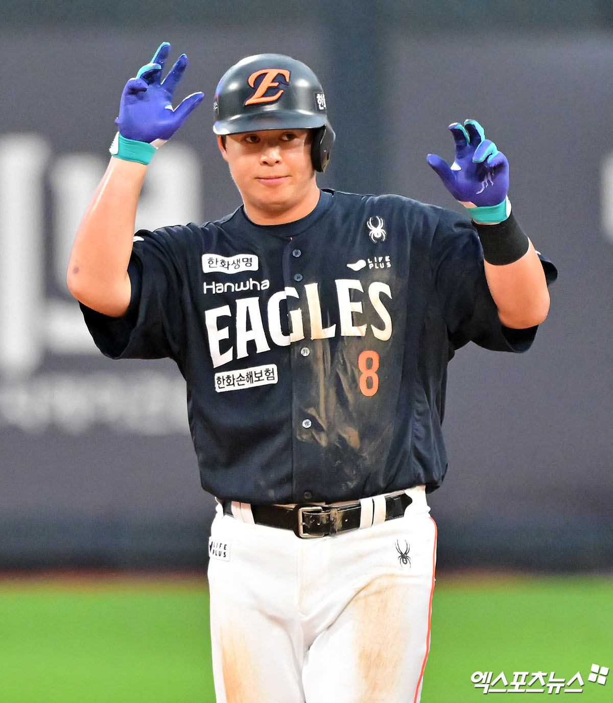 (엑스포츠뉴스 수원, 김한준 기자) 18일 오후 수원KT위즈파크에서 열린 '2025 신한 SOL Bank KBO리그' 한화 이글스와 KT 위즈의 경기, 3회초 2사 한화 노시환이 우중간 2루타를 날리고 있다.