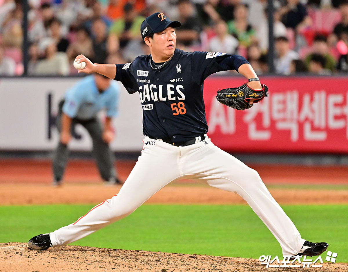 (엑스포츠뉴스 수원, 김한준 기자) 18일 오후 수원KT위즈파크에서 열린 '2025 신한 SOL Bank KBO리그' 한화 이글스와 KT 위즈의 경기, 7회말 한화 박상원이 공을 힘차게 던지고 있다.