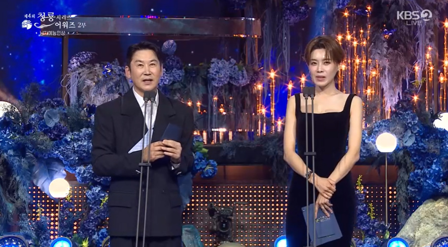 이날 신동엽과 장도연이 예능인상 수상을 위해 무대에 올랐다. 시상에 앞서 신동엽은 "저는 그런 해프닝을 처음 봤는데, 이준영 씨가 앞에 나왔다. 이준영 씨가 민망하게 표정을 지었던 건 계단 위에 올라오자마자 그 동작만 없었어도. 그 동작이 하.."라며 이준영의 실수를 언급했다.