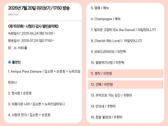 이번 방송에는 김소현, 손준호, 뉴위즈덤하모니, 에녹, 아일릿(ILLIT), 이찬혁, 주현미, 이찬원 등 다양한 장르와 세대를 아우르는 최정상급 국내 뮤지션들이 총출동한다.