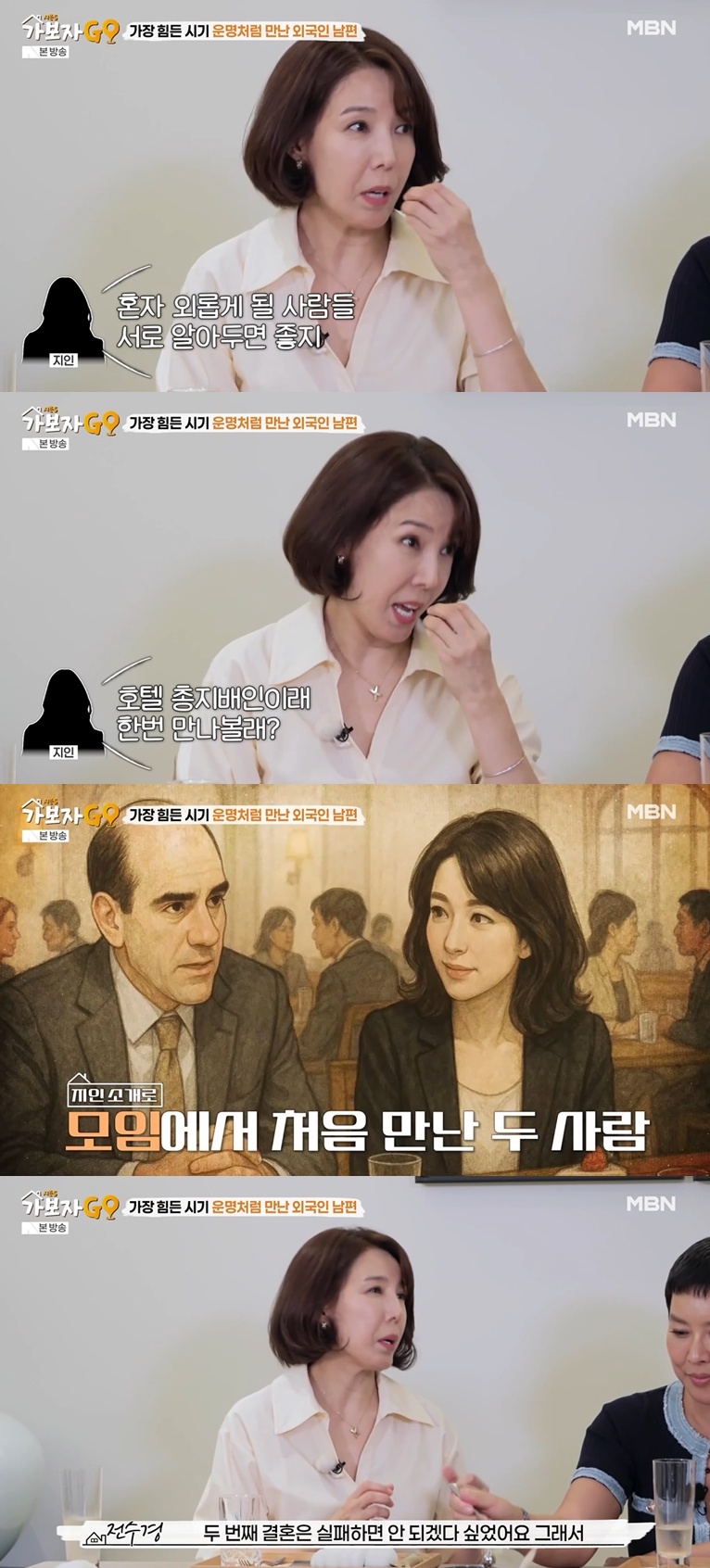 남편과의 첫 만남에 대해서는 "제가 (그 당시) 조금 아플 때여서 치료를 받기 위해서 일을 정말 힘들게 하다가 쉴 때"라며 "지인분의 지인이 '혼자 외롭게 될 사람들 서로 알아두면 좋지. 호텔 총지배인이래. 한번 만나볼래?'라고 했다"고 지인 소개로 모임에서 만나게 됐음을 밝혔다.