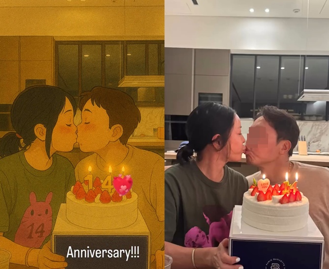 영상 속 이혜영은 입고 남편과 함께 케이크 앞에서 다정하게 입맞춤을 나누고 있는 모습. 케이크 위에는 '14' 숫자 초가 꽂혀 있어 결혼 14주년을 기념하는 의미를 더했다. 변함없는 두 사람의 애정이 눈길을 끌었다.