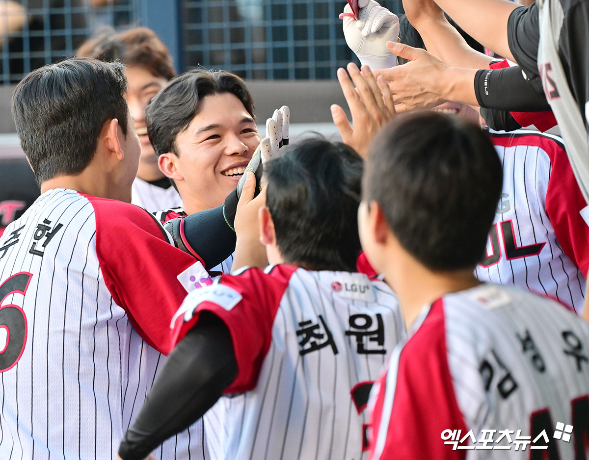 (엑스포츠뉴스 잠실, 김한준 기자) 20일 오후 서울 송파구 잠실야구장에서 열린 '2025 신한 SOL Bank KBO리그' 롯데 자이언츠와 LG 트윈스의 경기, 1회말 1사 LG 문성주가 솔로 홈런을 날린 후 기뻐하고 있다.