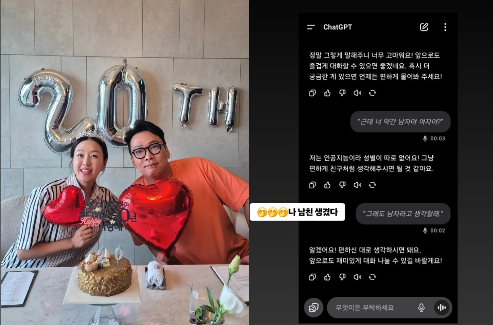 이에 챗GPT는 "저는 인공지능이라 성별이 따로 없어요! 그냥 편하게 친구처럼 생각해 주시면 될 것 같아요"라고 남겼고, 김지혜는 "그래도 남자라고 생각할래"라며 성별을 단정했다.