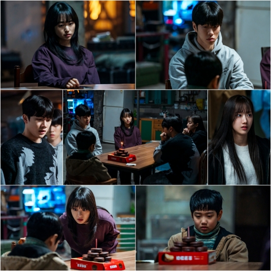 특히 리더 아현은 휴대전화를 앞에 두고 깊은 고민에 빠져 있는 모습으로 눈길을 끈다. 외부와의 연락이 차단된 상황에서 무엇인가를 기다리는 듯한 그녀의 불안한 눈빛은 첫 회부터 예측 불가한 사건이 터질 것임을 예고한다. 막내 시우의 돌발 행동에 충격에 빠진 아현과 굳은 표정으로 상황을 지켜보는 주안과 소미, 석수, 여기에 눈물을 흘리는 시우의 얼굴이 더해지며 긴장감은 한층 고조된다. 아이들 그룹에 합류함과 동시에 위기를 가져온 시우의 등장으로 이들의 운명이 어떻게 변화할지 관심이 쏠린다.