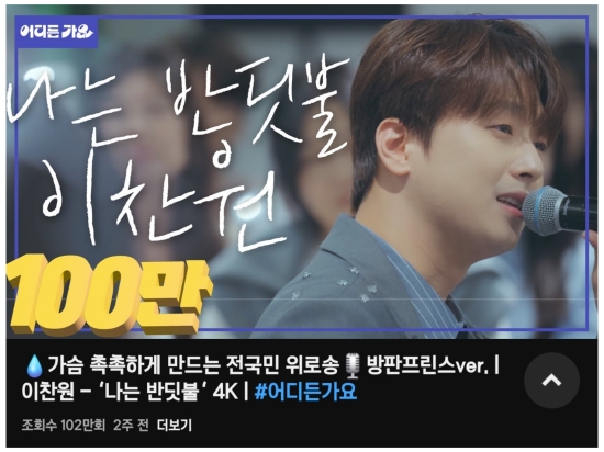 지난 5일 방송된 KBS 2TV '방판뮤직 : 어디든 가요'에서 이찬원이 선보인 황가람의 '나는 반딧불' 커버가 게재 약 2주 만에 유튜브 누적 조회수 100만 건을 돌파했다.