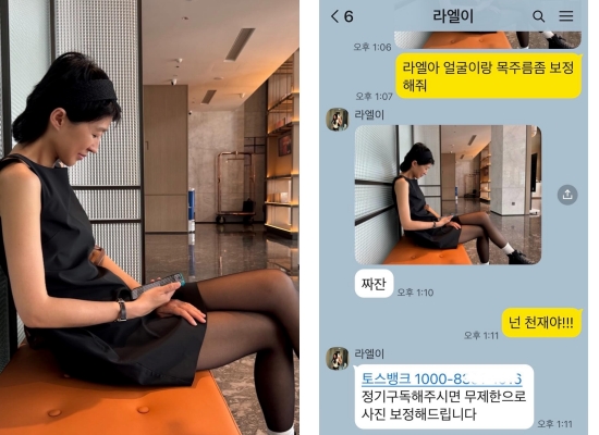 홍진경은 딸 라엘 양에게 "얼굴이랑 목주름 좀 보정해 줘"라고 했고, 이에 라엘 양은 "정기구독해 주시면 무제한으로 사진 보정해 드립니다. 한 달 구독 일 년 구독 선택지 있으신데 어떤 걸로 하시겠어요 고객님~?"라며 계좌번호를 보냈다.