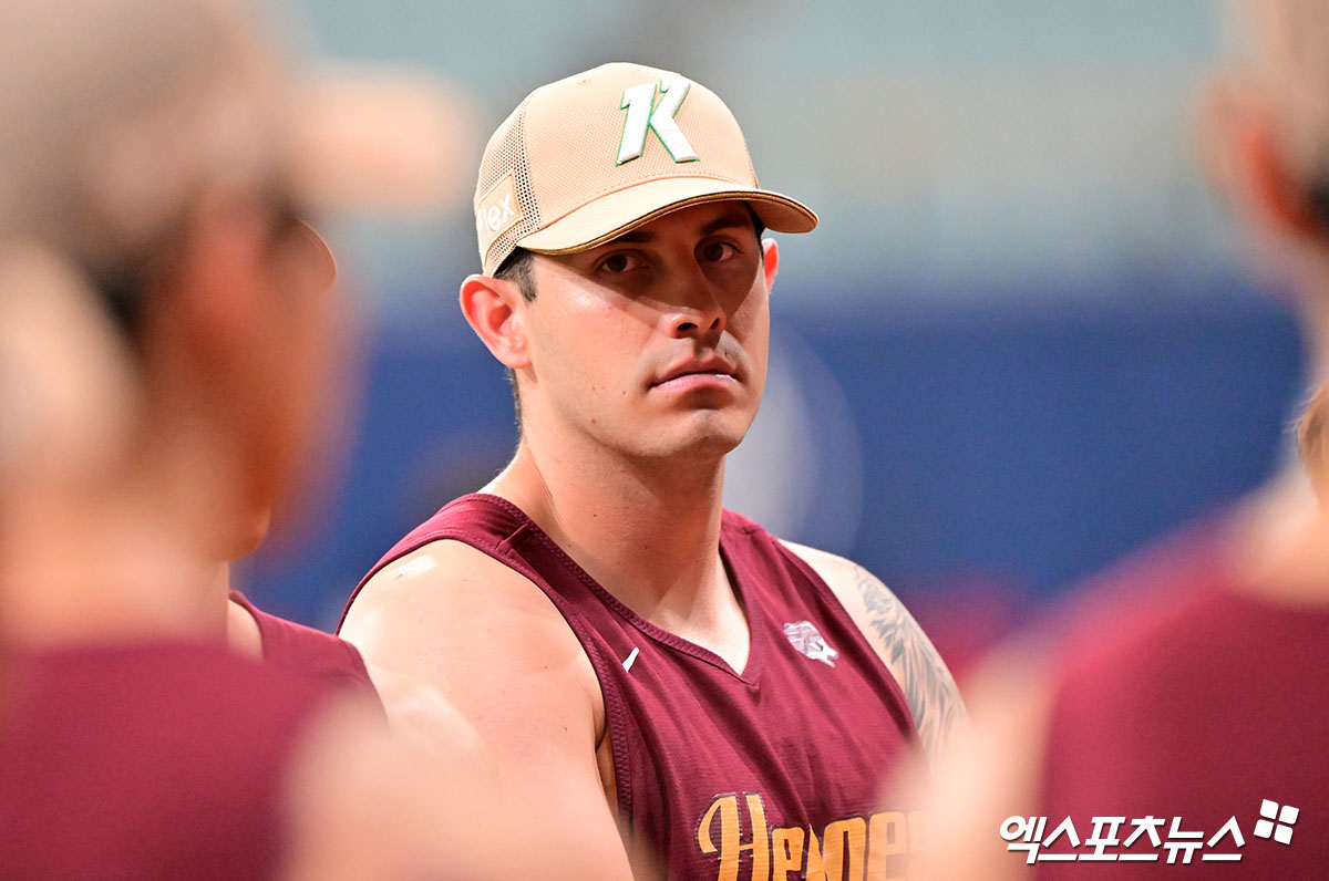 (엑스포츠뉴스 고척, 김한준 기자) 22일 오후 서울 구로구 고척스카이돔에서 열리는 '2025 신한 SOL Bank KBO리그' 롯데 자이언츠와 키움 히어로즈의 경기, 키움 카디네스가 미팅을 갖고 있다.