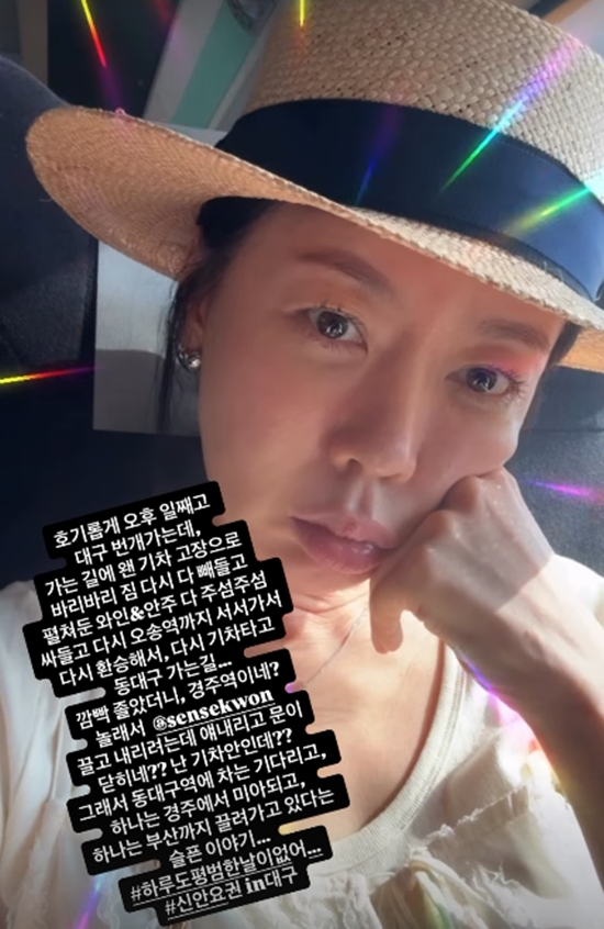 22일 안선영은 "호기롭게 오후 일 빼고 대구 번개 가는데 가는 길에 왠 기차 고장으로 바리바리 짐 다시 다 빼 들고 펼쳐둔 와인, 안주 다 주섬주섬 싸들고 다시 오송역까지 서서 가서 다시 환승해서 기차 타고 동대구 가는 길"이라는 글과 사진을 남겼다.