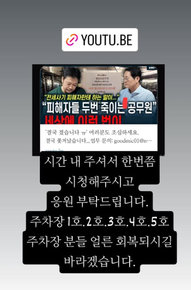 이어 최강희는 "주차장 1호, 2호, 3호, 4호, 5호 주차장 분들 얼른 회복되시길 바라겠습니다"라며 서울 강남구 논현동의 주차장 건물에서 전세사기 피해를 본 피해자들을 응원했다.