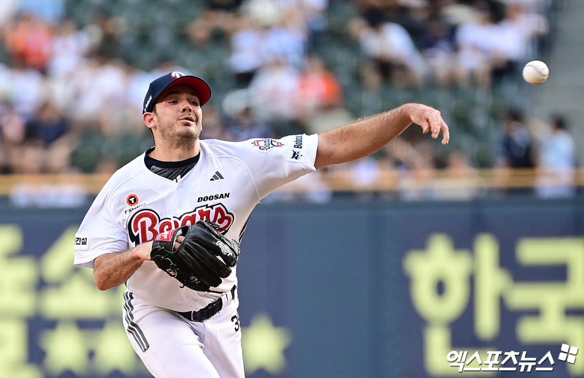 (엑스포츠뉴스 잠실, 박지영 기자) 22일 오후 서울 송파구 잠실야구장에서 열린 '2025 신한 SOL Bank KBO리그' 한화 이글스와 두산 베어스의 경기, 1회초 두산 선발투수 잭로그가 역투하고 있다.