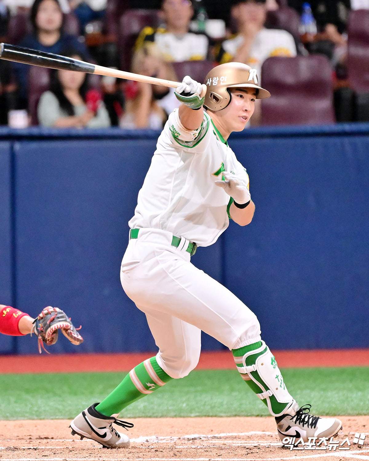 (엑스포츠뉴스 고척, 김한준 기자) 22일 오후 서울 구로구 고척스카이돔에서 열린 '2025 신한 SOL Bank KBO리그' 롯데 자이언츠와 키움 히어로즈의 경기, 1회말 1사 3루 키움 이주형이 1타점 적시타를 날리고 있다.
