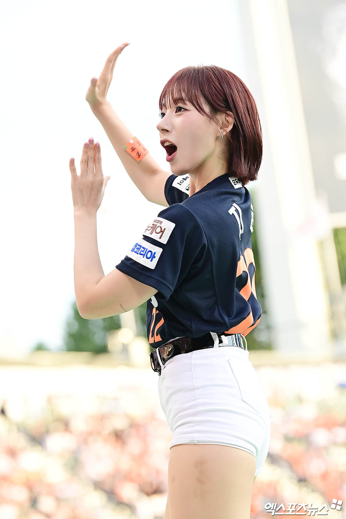 (엑스포츠뉴스 잠실, 박지영 기자) 22일 오후 서울 송파구 잠실야구장에서 열린 '2025 신한 SOL Bank KBO리그' 한화 이글스와 두산 베어스의 경기, 한화 치어리더 하지원이 열띤 응원을 펼치고 있다.