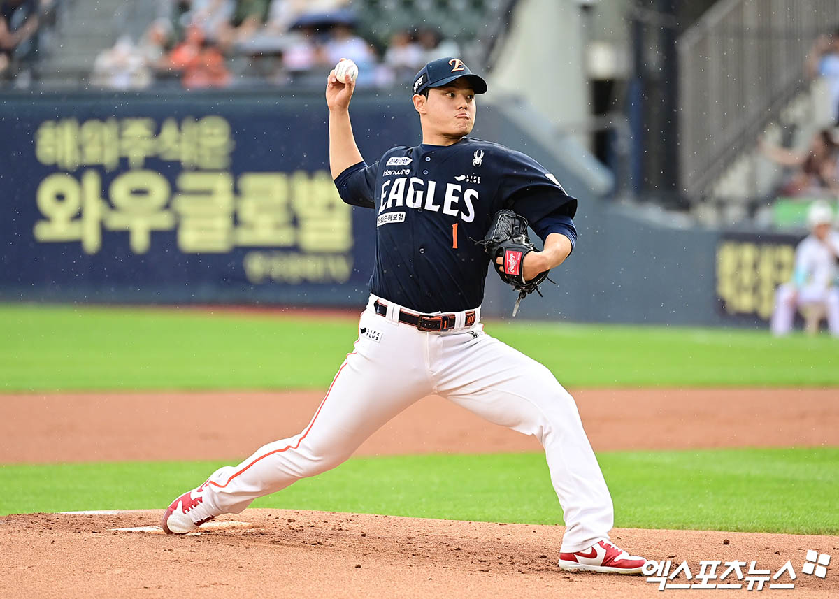 (엑스포츠뉴스 잠실, 박지영 기자) 22일 오후 서울 송파구 잠실야구장에서 열린 '2025 신한 SOL Bank KBO리그' 한화 이글스와 두산 베어스의 경기, 1회말 한화 선발투수 문동주가 역투하고 있다.