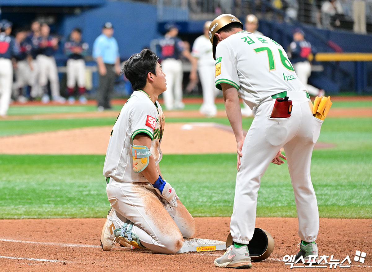 (엑스포츠뉴스 고척, 김한준 기자) 22일 오후 서울 구로구 고척스카이돔에서 열린 '2025 신한 SOL Bank KBO리그' 롯데 자이언츠와 키움 히어로즈의 경기, 6회말 1사 2,3루 키움 어준서가 병살타로 아웃된 후 아쉬워하고 있다.