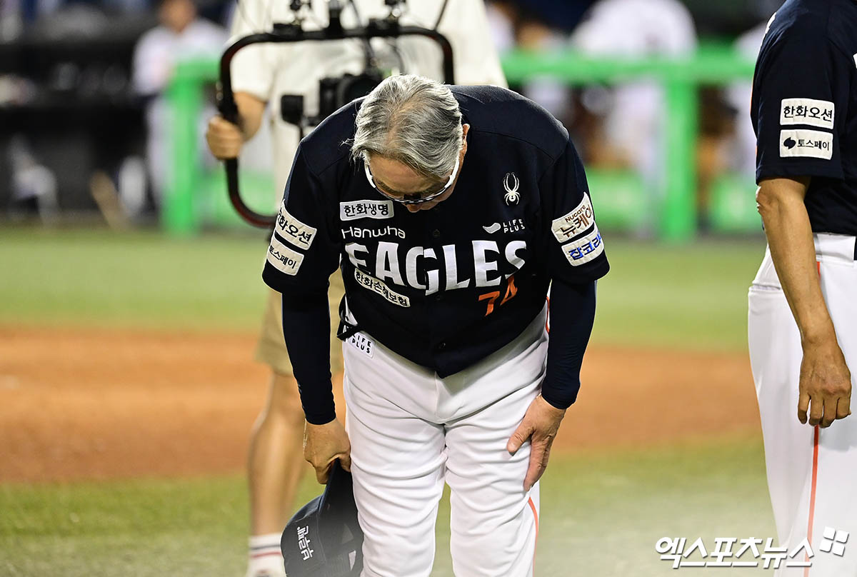 경기 종료 후 한화 김경문 감독이 관중석을 향해 인사하고 있다.