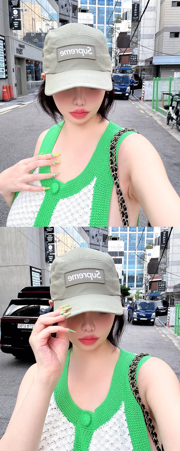 또한 초록색 포인트가 들어간 니트 민소매 상의를 입고 실루엣을 드러낸 과감한 스타일링으로 패션 센스를 뽐내 감탄을 자아낸다.