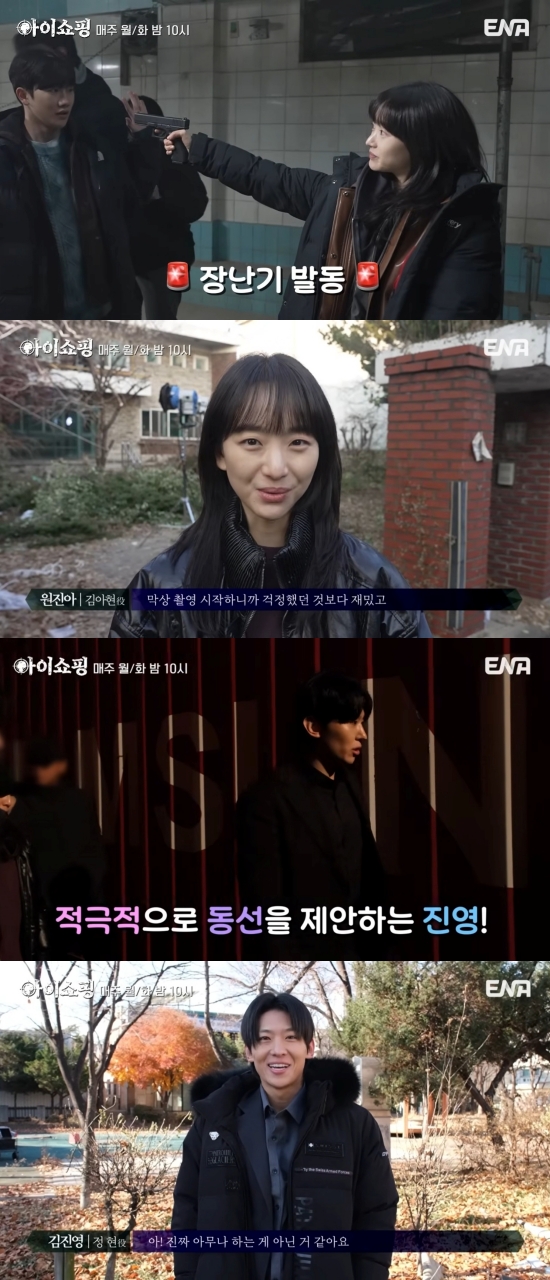 해당 영상에는 지난 21일 첫 방송한 ENA 드라마 '아이쇼핑' 속 액션 신 촬영 현장이 담겼다. 원진아는 소품용 권총을 받고 포즈를 취하는가 하면 순식간에 장난기를 보이면서 분위기 메이커 역할을 톡톡히 했다.