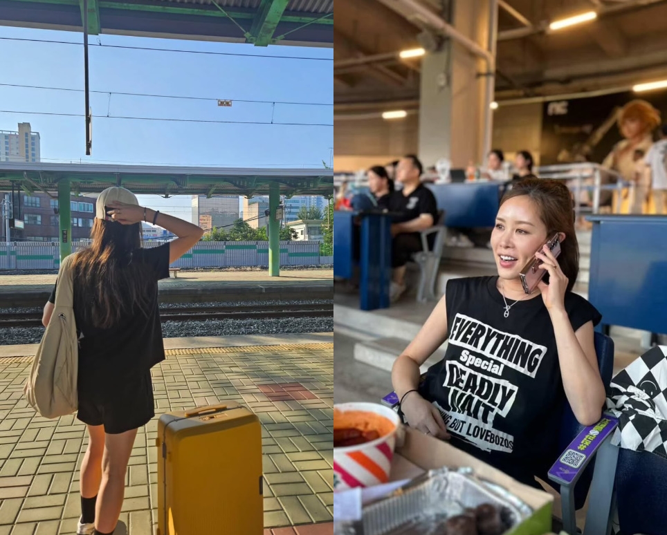 공개된 사진 속 채리나는 집으로 돌아가기 위해 마산역에서 기차를 기다리고 있다. 이어 채리나는 남편 박용근이 코치로 활동 중인 NC 다이노스의 홈구장 창원 NC파크에서 음식을 먹으며 경기를 관람하는 모습이다.