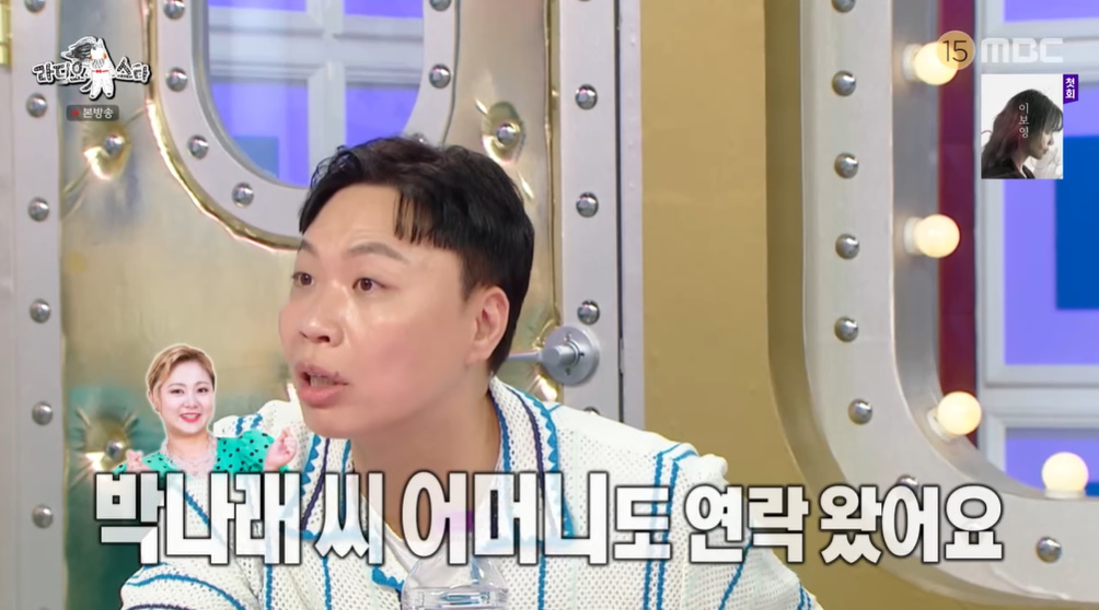 이어 이상준은 "(박나래의 어머니가) '나래랑은 아무리 얘기해도 안 될 것 같으니 나래의 촌 동생이 서울에 살고 있어서 만나봤으면 좋겠다. 내가 사위를 못 삼더라도 가족으로 들이고 싶다'고 말했다"라고 말했다.