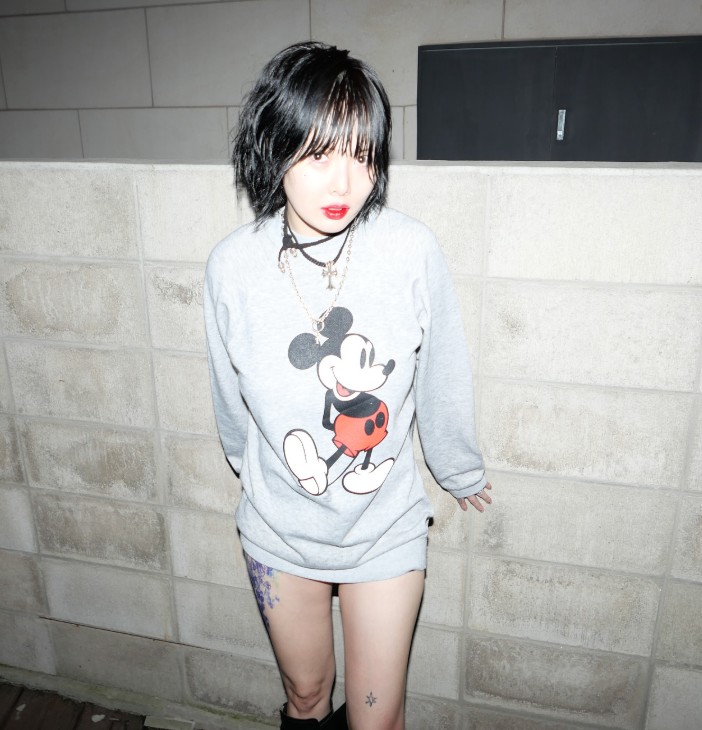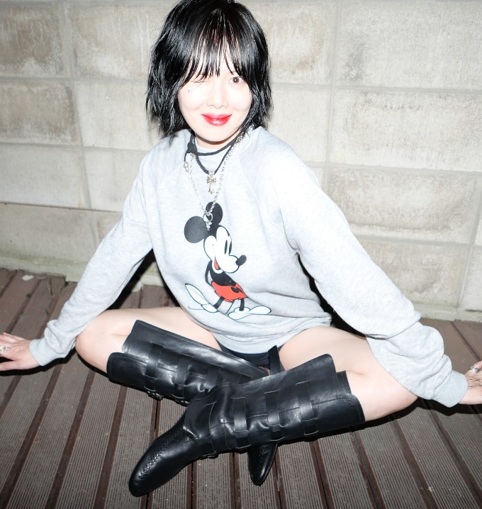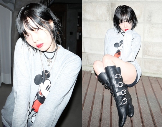 사진 속 현아는 미키 마우스 프린팅이 더해진 회색 맨투맨에 블랙 부츠를 매치해 독특한 스트리트 룩을 완성했다.