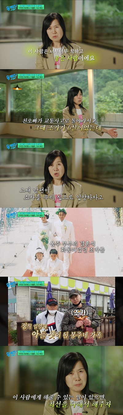 이봉주의 아내도 남편에게 고마운 마음이 크다고. 아내는 "이 사람은 너무너무 착하다. 너무너무 좋은 사람"이라며 "제가 너무 고마웠던 게 저희 조카가 되게 오랫동안 저희 집에서 자랐다"며 처조카를 입양하게 된 배경을 밝혔다.