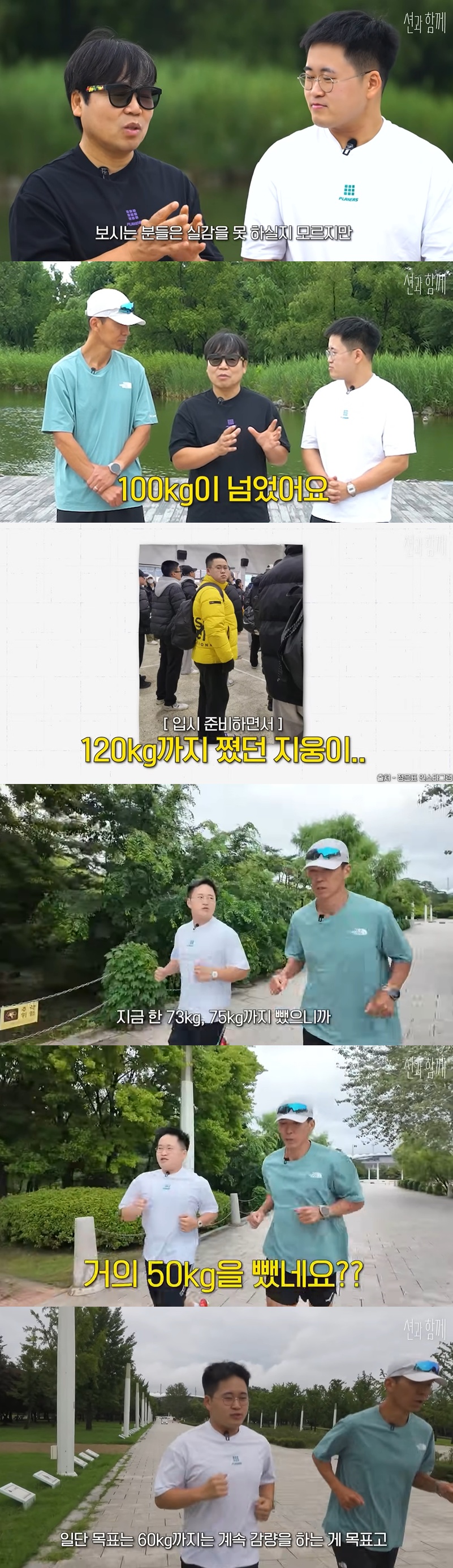 본격적으로 션과 정지웅이 러닝을 시작하며 근황 토크를 나눴다. 군대 전역한 지 일주일이 지났다는 정지웅은 "군대 가기 전에 120kg 찍었는데 지금 73kg, 75kg 뺐다. 사람 하나 거의 날아갔다"며 50kg를 감량한 근황을 전해 눈길을 끌었다.
