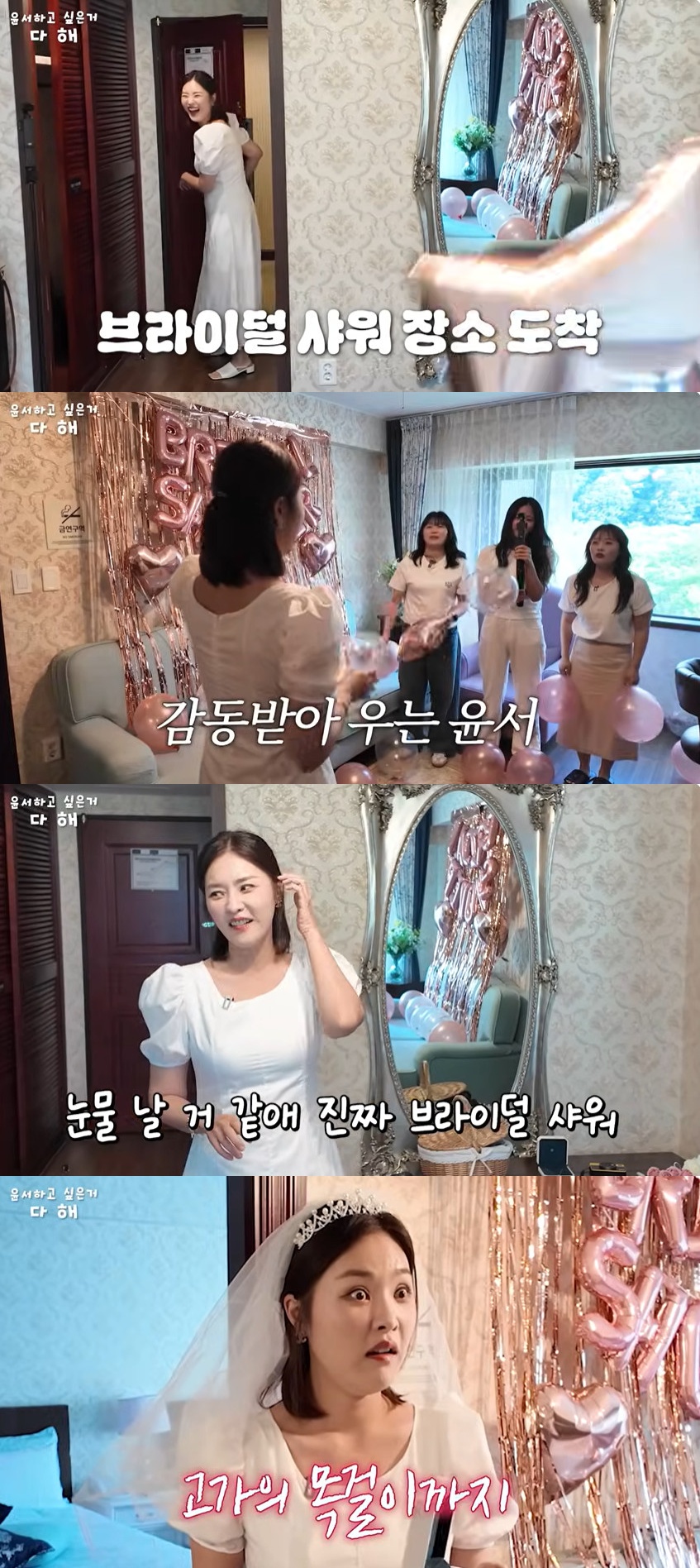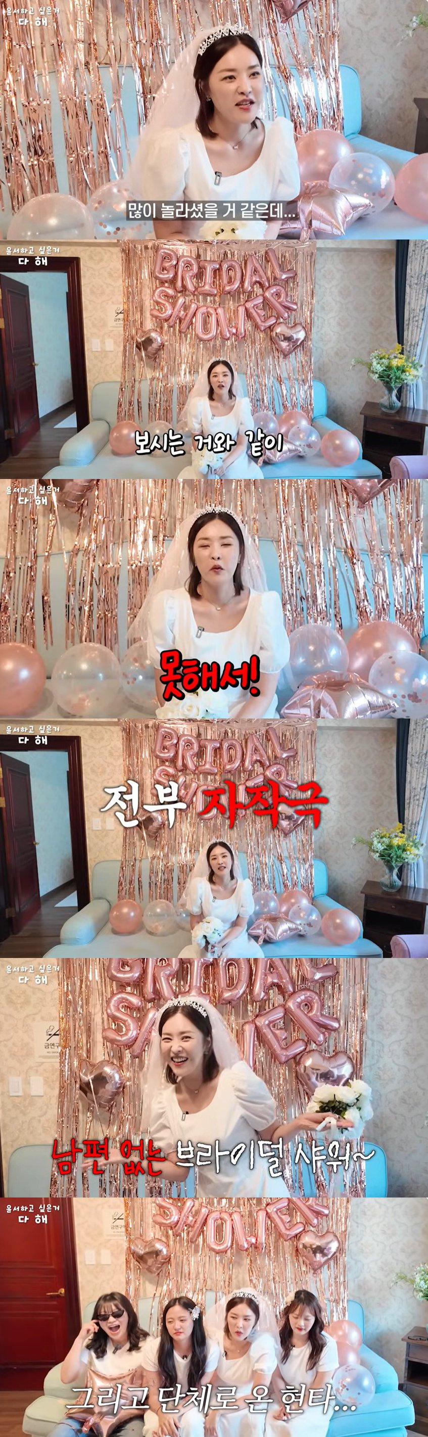 이후 한윤서는 "결혼 전에 해야 되는 게 바로 브라이덜 샤워다. 많이 놀라셨을 거 같은데 보시는 거와 같이 저는 결혼을 못 해서 지금 자작극을 하고 있다"고 실토했다.