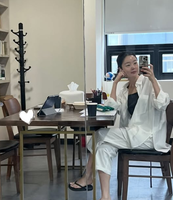 올화이트 셋업에 블랙 슬리브리스를 매치한 첫 사진에서는 여유로운 분위기 속에서도 도회적인 세련미가 느껴졌다. 의자에 편하게 앉아 셀카를 찍는 모습만으로도 화면을 가득 채운 분위기는 단연 돋보였다.