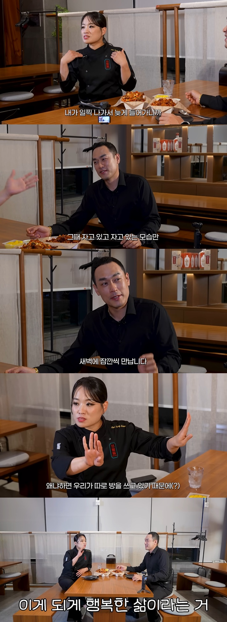 제작진은 두 사람에게 "두 분은 집에서 못 보냐. 가게에서만 보냐"고 물었고, 정지선은 "내가 일찍 나서 늦게 들어가니까 그때 (남편이) 자고 있는 모습만 (본다)"며 "집에 있는 거 생사 확인은 하는데 그거 말고는 볼 일은 없다"고 답했다.