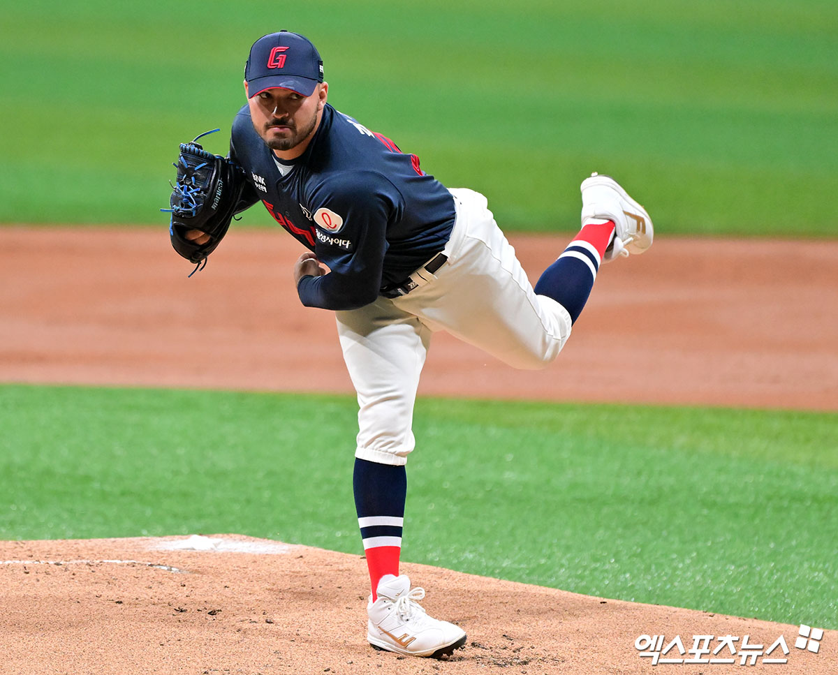 (엑스포츠뉴스 고척, 김한준 기자) 24일 오후 서울 구로구 고척스카이돔에서 열린 '2025 신한 SOL Bank KBO리그' 롯데 자이언츠와 키움 히어로즈의 경기, 1회말 롯데 선발투수 감보아가 공을 힘차게 던지고 있다.