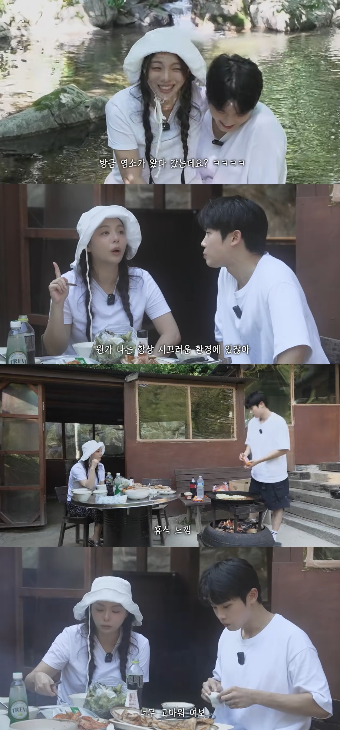 솥뚜껑 삼겹살과 김치, 라면을 즐기던 에일리는 "항상 시끄러운 환경에 있는데 고요하고 조용하니 어떻게 해야할지 모르겠다"고 이야기했고, 최시훈은 "이런 곳에 신혼 여행 이후로 오랜만에 왔다"는 소감을 밝혔다.