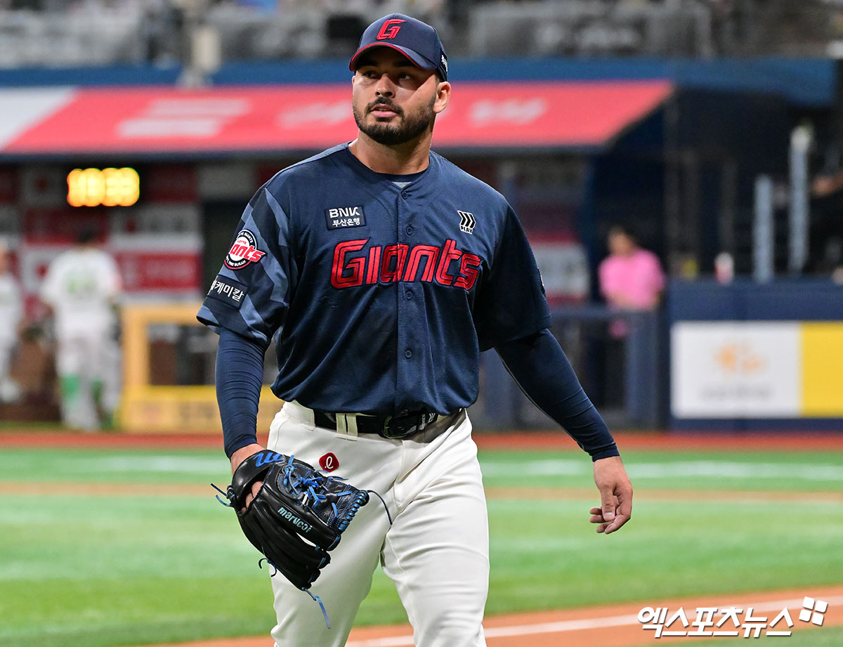 (엑스포츠뉴스 고척, 김한준 기자) 24일 오후 서울 구로구 고척스카이돔에서 열린 '2025 신한 SOL Bank KBO리그' 롯데 자이언츠와 키움 히어로즈의 경기, 4회말 수비를 마친 롯데 감보아가 더그아웃으로 향하고 있다.