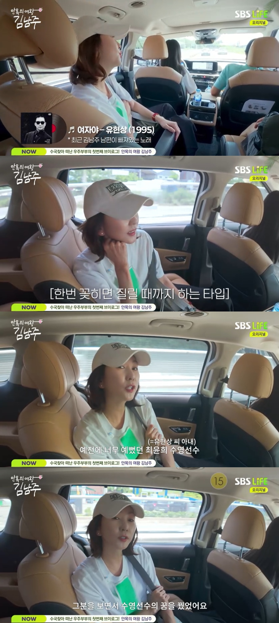 김남주는 "이틀 내내 저 노래 들어야 한다. 남편이 취한 건 아니다. 안 취했는데 저런다. 예전에 내가 어렸을 때 너무 예뻤던 최윤희 수영 선수가 아시아의 인어였지 않냐. 너무 멋있고 예뻐서 그분을 보면서 수영선수의 꿈을 꿨다. 근데 운동신경이 안 좋았다"라며 유현상의 아내인 최윤희를 언급했다.