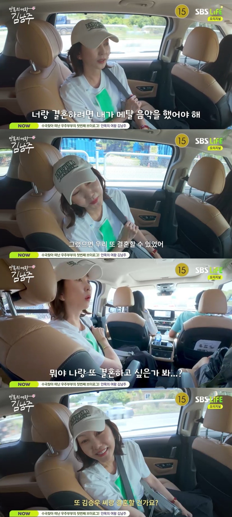 김승우는 "너랑 결혼하려면 메탈을 했어야 한다. 나중에 트로트로 전향을 해서. 그랬으면 우리 또 결혼할 수 있었다"라며 다시 태어나도 김남주와 결혼할 것임을 넌지시 밝혔다.