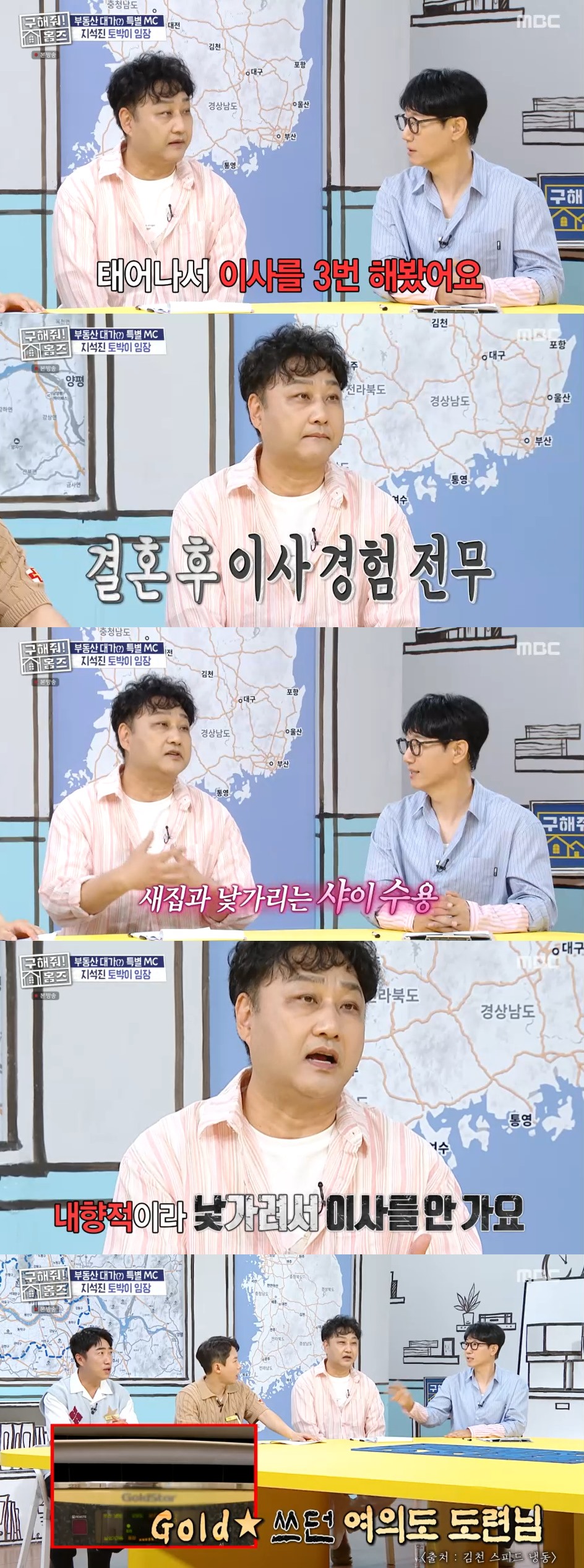 이날 김수용은 "이사를 별로 좋아하지 않는다. 태어나서 이사를 3번 해봤다. 여의도 살다가 부모님 집 갔다가 분가해서 결혼하고 한 번도 이사 안 했다"라고 밝혀 놀라움을 자아냈다.