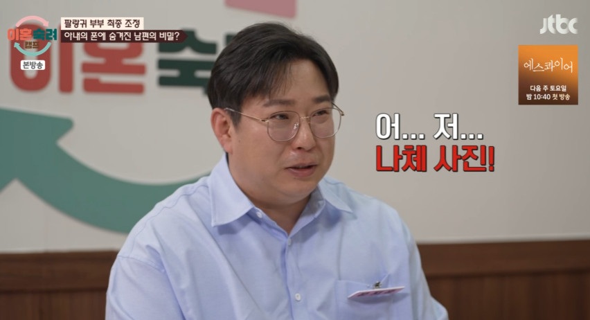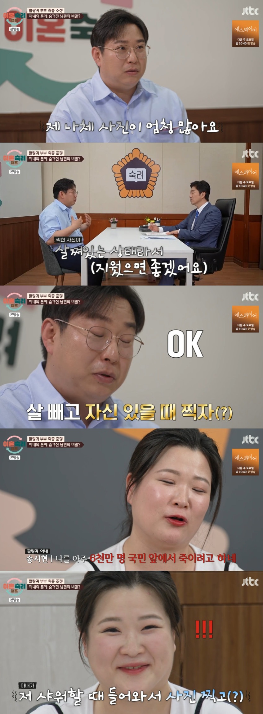 남편은 "제 나체 사진이 많다. 가지고 있을 거다. 다 지웠으면 좋겠다"고 이야기했고, 변호사는 "괜찮은 건 빼고 지우는 건"이라고 운을 뗐으나 남편은 단호히 "살쪄있는 상태라 (지웠으면 좋겠다)"고 못을 박았다. 그러나 살을 뺀 상태에서 다시 찍는 건 괜찮다고 밝혀 또 다른 충격을 안겼다.