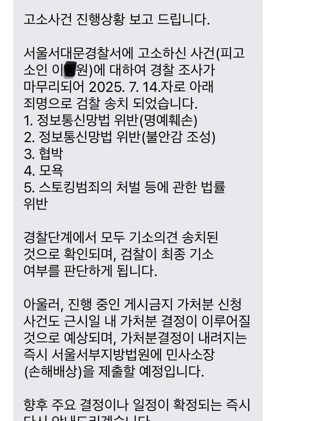 지윤미는 "경찰 조사는 모두 마무리되었고, 2025년 7월 14일, 전 혐의에 대해 '기소의견'으로 검찰에 송치되었습니다"라며 "현재 진행 중인 게시금지 가처분 신청도 곧 결론이 날 예정이며, 그 결정이 나는 즉시 민사 소송(손해배상 청구) 역시 진행할 계획"이라고 밝혔다.