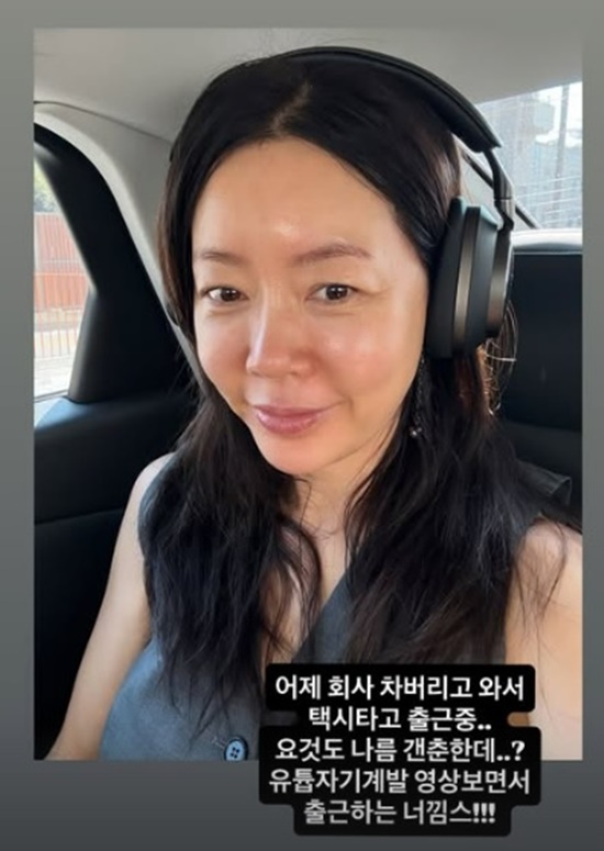 공개된 사진에는 수수한 민낯에 헤드폰을 쓴 안선영이 택시를 타고 이동 중인 모습이 담겨 있다.