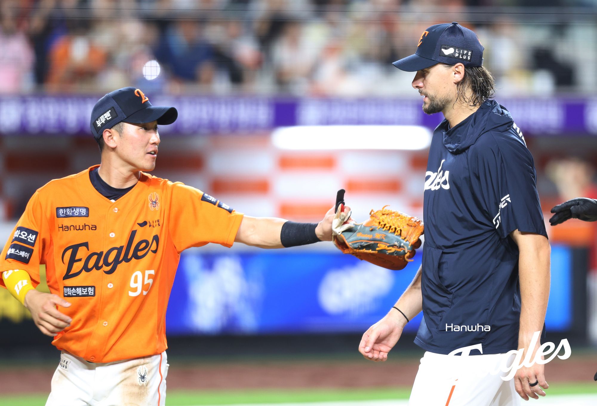 이날 대전의 최고 기온은 37도에 달할 정도로 뜨거웠다. 많이 더웠을 것 같다는 말에 와이스는 "그렇다. 오늘도 정말 더웠고 직전 경기에서도 정말 더웠는데, 저번 선발 등판이 끝나고 땀을 많이 흘리니까 양상문 코치님이 먼저 긴소매(언더셔츠)를 입는 게 어떠냐고 제안하셔서 오늘은 입고 등판을 했다"고 설명했다.