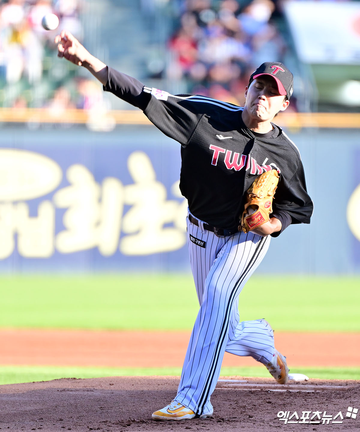 (엑스포츠뉴스 잠실, 김한준 기자) 26일 오후 서울 송파구 잠실야구장에서 열린 '2025 신한 SOL Bank KBO리그' LG 트윈스와 두산 베어스의 경기, 1회말 LG 선발투수 임찬규가 공을 힘차게 던지고 있다.