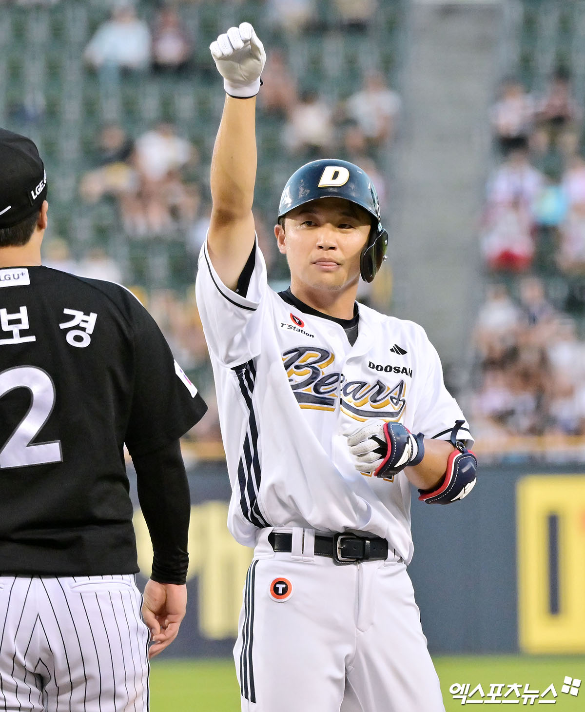 (엑스포츠뉴스 잠실, 김한준 기자) 27일 오후 서울 송파구 잠실야구장에서 열린 '2025 신한 SOL Bank KBO리그' LG 트윈스와 두산 베어스의 경기, 4회말 무사 2,3루 두산 박계범이 1타점 적시타를 날리고 있다.