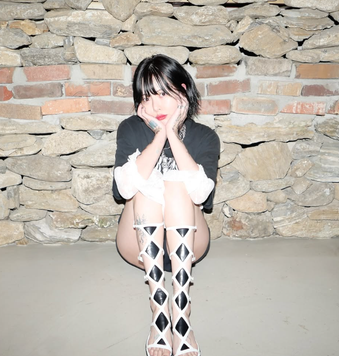 또한 현아는 돌담 앞에 앉아 꽃받침 포즈로 카메라를 응시하고 있다. 다이아몬드 패턴이 돋보이는 독특한 니하이 부츠가 시선을 사로잡았다.