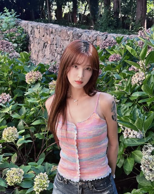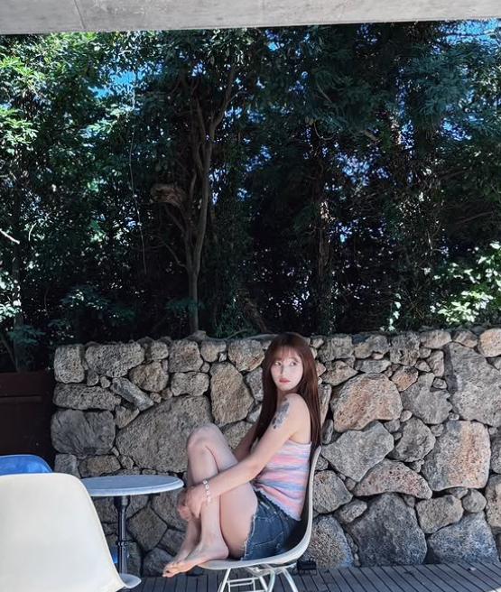 사진 속 율희는 핑크빛 스트라이프 민소매 탑과 데님 쇼츠를 매치한 여름 룩을 선보였다. 어깨 타투도 자연스럽게 드러나 감각적이면서도 자유로운 분위기를 자아냈다.